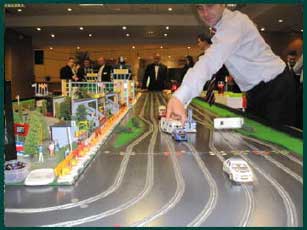 Scalextric Events take place on a purpose-built model of an eight-lane racing circuit with hazard chicanes, hairpin bends and blistering straights.