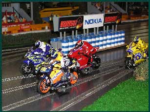 Lined up on the starting line are these very special Scalextric Bikes - Eight in total. The Start lights turn to Green and it's a race to the Finish!